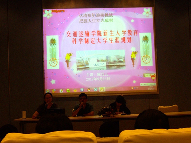 首场讲座由学院党总支副书记赵睿老师主讲,题目是《大学与人文》,赵老师用“何为大学?大学何为?今天我们为什么要读大学?如何规划好四年的大学生涯?”这四个问题来开场,引发同学们的思考,并多角度、多层次的对大家阐述了她自己对大学的理解,对大学生活的理解,对大学应该做些什么的理解,让与会的同学意识到:大学不仅仅是学习养家糊口的本领的地方,大学之所以为大学,是因为大学有一种有别于企业、军队等的“内在精神”,大学有一种独特的人文气息在支撑着。第二场讲座是陈佳儿老师主讲,讲座的内容是大学生活规划与管理,陈老师通过数据和图表融合的方式,结合丰富多彩的案例,引发了新生的思考与共鸣,让新生对今后四年的大学生活规划与管理有了一个大概的目标,为以后的学习和大学经历提供了努力的方向。第三场讲座由陈莉老师开展,内容主要是校史和院史介绍,陈老师是我校03级航运管理专业学生,至今在校的时间算上学习和工作已接近十年,对于学校和学院的各项情况均比较了解,讲座中以自己的切身体会,深入浅出的将一些学校和学院的历史以及在海大的生活经验介绍给在座的同学们,过程中不仅有严谨的专业心理知识也不缺诙谐幽默的语言,引的全场笑声连连,掌声不断。