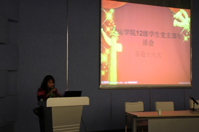 2012年11月7号中午,交运学院12级学生党支部在交运学院报告厅开展以“喜迎十八大”为主题的组织生活会。交运学院12级学生党支部书记朱红红老师、全体预备党员以及入党积极分子参加了此次活动,活动由喻志文同志主持。
