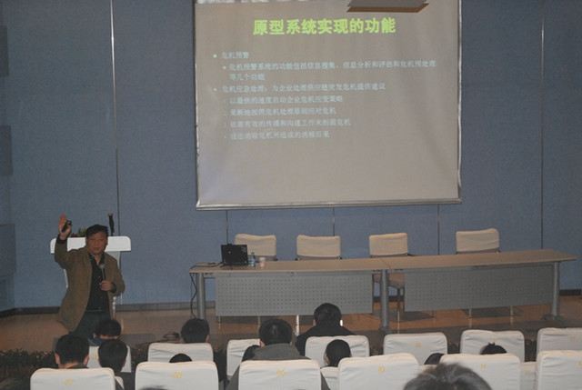 11月14日下午交运楼学术报告厅里教师和研究生济济一堂,复旦大学管理科学系博士生导师,物流与供应链管理专家宁钟教授的“基于案例推理的供应链突发危机应急处理原型系统研究”学术报告会正在进行。宁教授在阐述了供应链风险、非传统安全和供应链突发危机等概念的基础上,重点介绍了基于案例推理的CBR方法,以及原型系统的实现和运行实例。学术报告十分精彩,信息量大,富有启发性。会上教师和研究生与宁教授就学术报告,以及复旦大学的研究与教学实际进行了多方面的互动,既有精彩点评、学术观点分享;也有问题提问和会后个别交流。学术报告会由刘伟教授主持,院长施欣教授对其前来学术演讲表示诚挚的欢迎和感谢。