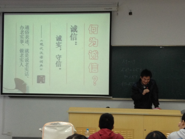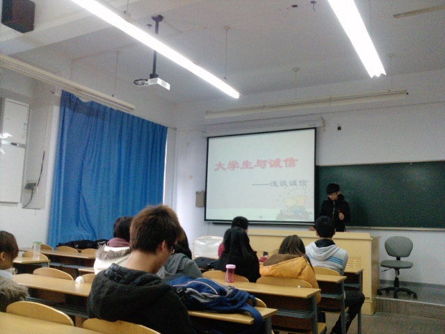 20121126日物流103班全体同学在班长、团支书等班委的组织带领下开展了关于“大学生诚信”的主题班会活动。