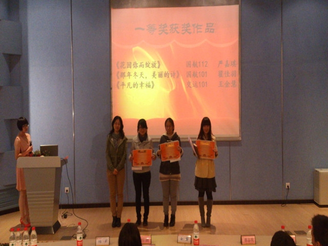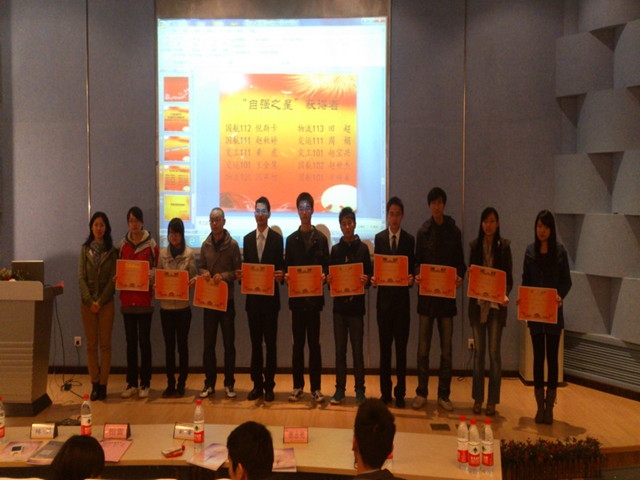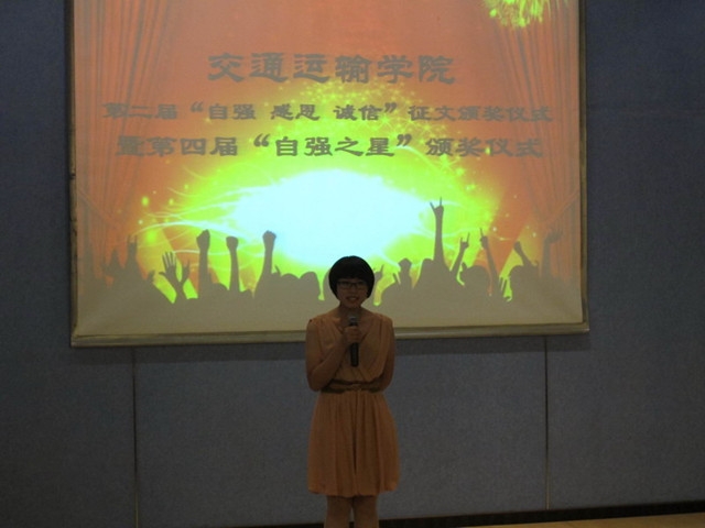 颁奖仪式开始时由赵睿老师致开场辞,简要总结了2011—2012学年学院的资助工作,并结合自身奋斗历程对十位自强之星及参加颁奖仪式的2012级家庭经济困难学生给予了充分的鼓励;征文比赛的颁奖仪式在一等奖作品“花因你而绽放”深情的选段朗诵中拉开序幕,颁奖仪式采用由交运学院第一、二届自强之星宣读征文评语即颁奖词的方式向征文获奖同学颁发了征文合集及荣誉证书;随后赵睿老师宣读了免费成人电影 第四届 “自强之星”的获奖者名单,其中来自四个不同专业的“自强之星”代表采用PPT演讲的方式展示了他们在大学期间的生活学习感悟,蜕变得更加自信的他们都用自己的自强之心写出了各自的精彩和一份感恩的心。