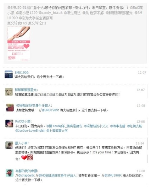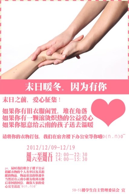 此次活动面向全校,共分为三个阶段展开。第一个阶段是活动筹备与宣传阶段,从12月9号至12月14号,50-51号楼自管会通过自管会官方微博、晚点名以及海报宣传等方式,向大家征集旧衣物,在整个学校内都形成了很好的氛围与效应。第二阶段便是开放自管会办公室,正式征集衣物,每次值班都会有很多同学送来衣物,自管会对每一位捐赠衣物的同学都做了详细的信息登记与整理,整个征集阶段一直持续至12月19日。最后一个阶段便是自管会负责将衣物寄送至云南省怒江州贡山县捧当小学。届时,自管会还将会把捧当小学寄回的感谢信张贴于50-51号楼下大厅,表达对所有捐赠衣物的同学们的感谢。
