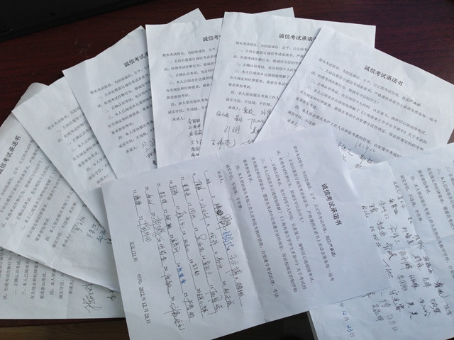 活动包括两个方面,一个是诚信考试承诺书,另一个是诚信考试横幅。承诺书列出了学生在校期间积极遵守学校各项教育教学制度、考试规章制度的承诺,倡导学生以积极进取的精神面貌认真学习,坚持不作弊的良好考试道德,各班级通过开班会和班委带头宣读承诺书等方式,将承诺内容告知所有同学,得到了每位同学的认可,并在承诺书上签名倡议。同时,学院也制作了关于诚信考试的横幅,同学们积极在倡导诚信考试的横幅签上自己的名字,做出诚信考试的庄严承诺。