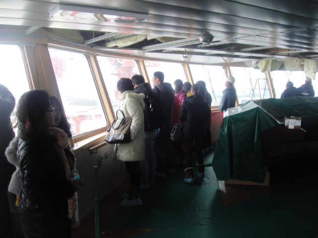 “育明”号远洋教学实习船是目前国际上投资规模最大、设施配备最为先进、功能最齐全的远洋教学实习船。船载重4.8万吨,总长189.90米,型宽32.26米,型深15.7米,设计吃水10.3米,服务航速14.2节,可供160名学生实习并搭载45800吨散装货物,集航运教学、科研以及货物运输为一体。在实习轮工作人员的带领下教工党员仔细参观了驾驶台(正在整改中),中海国际报告厅、会议室、船长休息室、学生宿舍、餐厅、篮球场、健身房及多功能娱乐室等设施设备,受到了极大的震撼。