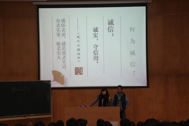 首先朱老师提出了“做诚信人,办诚信事”的口号,并结合海尔集团的营销理念以及部分留学生的求职遭遇强调了诚信的重要性。接下来,朱老师提出了要诚信考试的口号,宁可挂科,也绝不作弊,要树立正确的考风考纪观念和诚信意识,坚决杜绝考试作弊现象。最后,朱老师指出,诚信是为人之本、立人之本、树人之本,所以希望每一位同学都是诚实守信的新时代大学生。