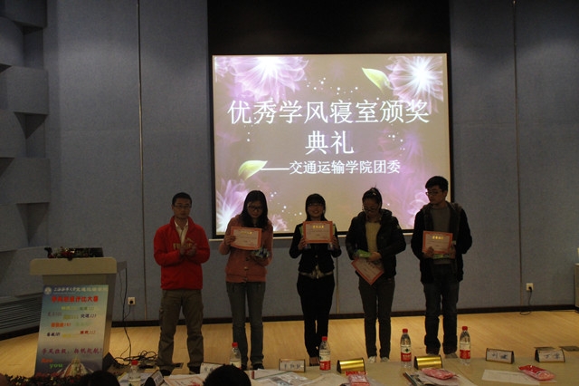 2013年4月10日下午1点,交运学院在交运报告厅组织开展了学风寝室颁奖典礼,免费成人电影 辅导员朱红红老师、徐晓毅老师、万京老师、李迎旭老师、朱岚老师和陈思琪老师出席本次颁奖典礼,各获奖寝室代表上台领奖。