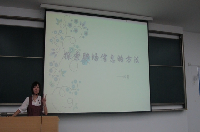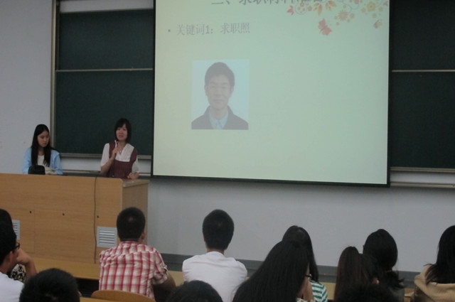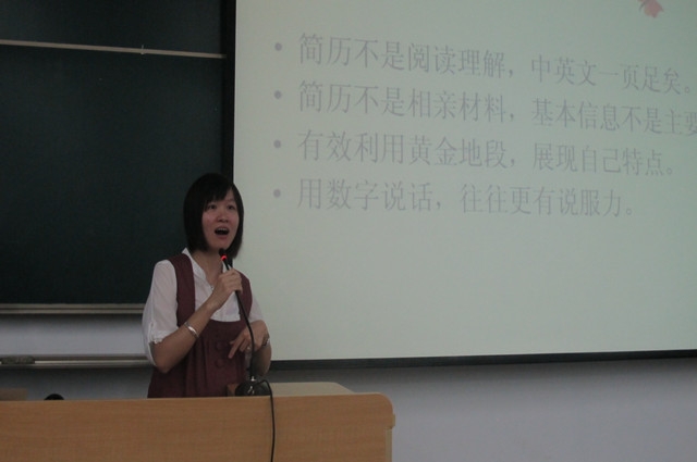 首先,陈莉老师向同学们讲述了本次讲座的目的是为了使同学们大四面对求职时有更充分的准备。接着,陈莉老师介绍了一些获取就业信息的途径,比如通过学校的就业指导中心,参加学校里的企业宣讲会;登录一些求职网站,比如中华英才网、智联招聘等;通过已经毕业的校友获取信息等等。然后,陈莉老师又向同学们讲解了制作简历的重要性以及一些细节问题,并且讲解了网投简历的技巧。最后,陈莉老师鼓励同学们,要抓住每一次机会,认真对待。