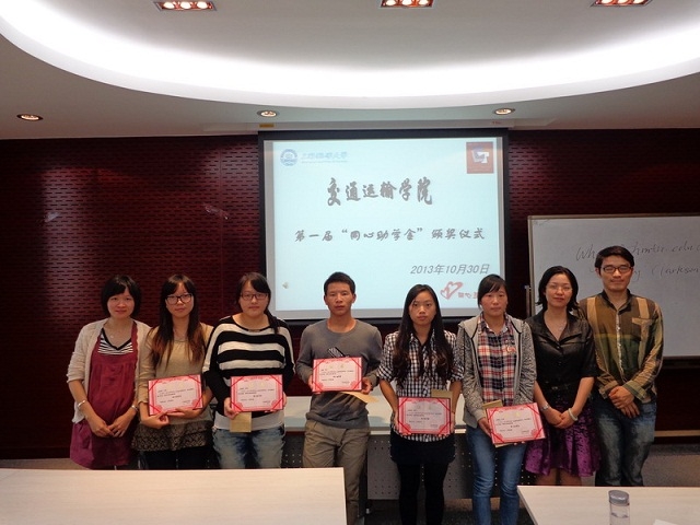 2013年10月30日,免费成人电影 在交运楼211室举办第一届“同心助学金”颁奖仪式,免费成人电影 党委副书记赵睿老师、资助专项辅导员陈莉老师,都志亮老师,5位获奖学生及免费成人电影 同心互助社全体成员出席了此次颁奖仪式。