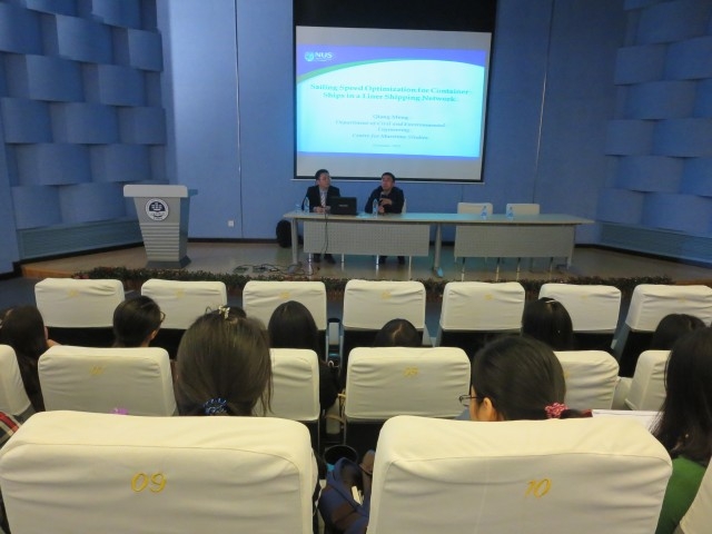 孟教授首先对新加坡及新加坡国立大学的相关情况、学术成就、以及参与的项目进行简单介绍,其中就最新研究APL的合作项目,孟教授作了详细的介绍。接着,以新加坡国际航运网络为背景,讲述了各大船公司关注的核心问题:油耗问题,针对此问题,孟教授利用历史数据对班轮的燃油消耗与班轮的速度进行了分析,研究发现班轮速度对燃油消耗有着重要影响。孟教授还就这个问题利用数学方法对此进行详细的分析,利用相关软件,巧妙地解决了该问题。这项研究对船公司航线安排,船期表制定有着重要的借鉴作用。