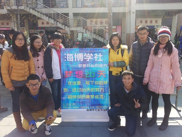 2013年12月19日中午,海博学社在北广摆摊,号召同学们参加社团组织的“梦想20天”活动。活动主要采取写明信片的方式,旨在激励同学们树立正确的人生理想并积极奋斗实现理想。