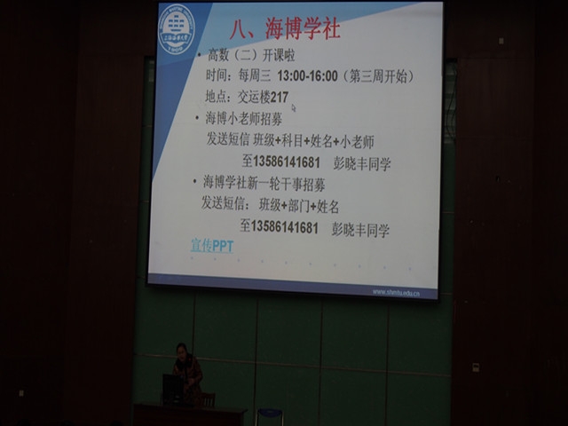 本次活动主要为海博学社干事及小老师招新。海博学社此次共有五个部门进行招新活动,分别为学术部,宣传部,秘书部,活动部,外联部。对于干事而言,可以通过在海博的锻炼获得一些经验,认识更多志同道合的朋友。对于小老师来说,将会获得学院颁发的正式聘书,更能为自己未来评优及就业简历添上闪亮的一笔。海博学社旨在为大家提供一个展示交流的平台,一个发挥个人能力的舞台和一个增强自身各方面素质的机会。通过这次的宣传活动,希望能让更多的同学了解海博学社,并且加入海博学社,一起努力,共同进步。