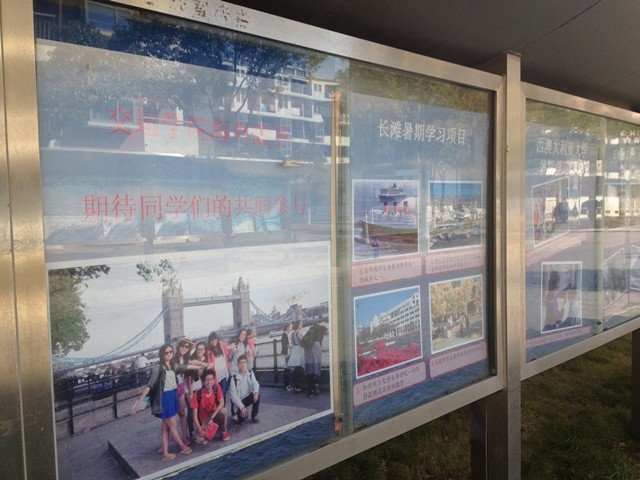 橱窗的展示内容为学院的五大游学项目,分别为英国普利茅斯大学暑期游学项目、美国圣马丁大学暑期游学项目、美国加州州立大学长滩分校暑期游学项目、西澳大利亚大学暑期游学项目和韩国仁荷大学暑期游学项目。橱窗展板充分展示了各个项目中大学的教学内容、校园环境、学生收获以及往届参与学生的丰富多彩的照片,让不同年级,不同学院的学生了解暑期游学,鼓励同学们积极参与游学,了解国外先进的教学内容和理念,感受不同地区的风土人情和文化,长闻见识。