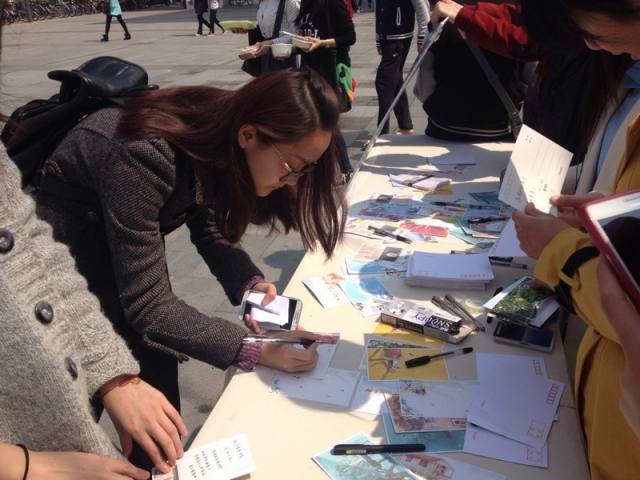 梦想八十八天活动是让同学们在喜欢的明信片上写下自己希望在八十八天后达到的目标,然后交予社团成员,社团成员再用写有各位同学名字的信封妥善保存。在八十八天后,海博学社将会在北广挂出这些信封,让写下梦想的同学取回信封,见证各位同学梦想的实现。在人来人往的北广,海博学社成员们大力宣传活动,吸引了很多感兴趣的同学们,活动现场人头攒动,同学们积极咨询,并且踊跃参与,在选好的明信片上娓娓道来,小小的笔端缓缓流淌出殷殷的期望。