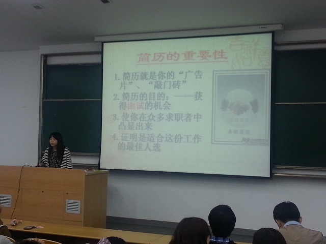 在讲座中,朱老师首先谈到关于求职简历的重要性和注意点,并向大家强调,求职简历之于我们就像是“敲门砖”。然后朱老师着重讲到了关于简历制作的主体,一份简历最基本的构成内容,同时列举了一些在简历制作中遇到的常规问题,之后还特地强调了一些细节性的问题,例如排版、照片等等。最后,朱红红老师特别指出了在实际中,简历作为HR选人的第一步,所需要具备的基本要求,强调一份好的简历是迈向成功的第一步。