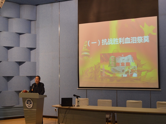 讲座开始吴老师与同学们分享了自己的艰辛求学经历,告诉年轻的学生朋友们刻苦学习、奋勇拼搏是通往成功之路的基石,积极乐观的人生态度、高尚的品格是前行路上的支柱。紧接着吴老师向在座学生生动地讲述了中国的抗战史,阐述抗战胜利的伟大意义。2015年是世界反法西斯战争暨中国抗日战争胜利70周年。70年前中国人民经过八年艰苦卓绝的抗日战争,无数英勇军民身先士卒浴血奋战,最终取得了抗战的伟大胜利,为世界反法西斯战争的胜利做出了巨大贡献。在座的学生认真聆听讲座,重温了抗战历史,追忆革命先烈为祖国的解放、人民的幸福剖头颅洒热血的英雄壮举。最后,吴老师提到作为新时期的大学生,更应牢记历史惨痛教训,学习抗战精神,以实现中华民族伟大复兴为己任。