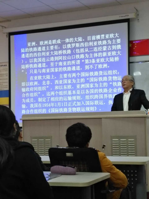 王教授的报告分4个部分。首先介绍了我国国际铁路运输的由来、历史发展及现状,随后介绍了2015年新版的《国际货协》规则,之后分析了亚欧铁路货物直通运输,最后在报告阐述了“一带一路”建设与内陆开发的关系。整个教室座无虚席,师生积极互动,学生们取得了良好的学习效果。