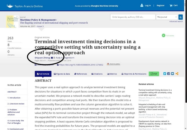 SSCI期刊《Maritime Policy & Management》刊登了2017年度候选最佳论文(共8篇),其中之一是免费成人电影 郑士源教授发表的题为“Terminal Investment Timing Decisions in a Competitive Setting with Uncertainty Using a Real Option Approach”的学术文章。