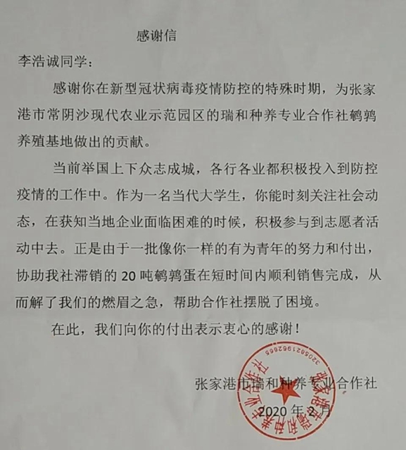 附:江苏省张家港市瑞和种养专业合作社给李浩诚同学的感谢信