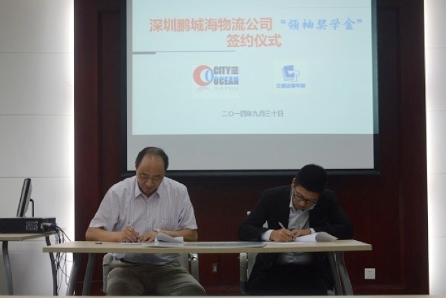 2014年9月30日上午10:30,深圳鹏城海物流有限公司在我校免费成人电影 交通运输专业设立的“领袖奖学金”签约仪式在交运楼207举行。院党委书记冯晨曦老师、党委副书记赵睿老师、学生资助中心主任相雷老师、深圳鹏城海物流有限公司华东区总经理郁凯宇先生、市场部经理虞恩华先生以及交运专业学生代表参加了签约仪式。签约仪式由免费成人电影 团委书记曾令伟老师主持。
