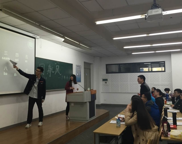 由于活动从报名阶段就受到了广大海事同学的关注,许多对沪粤语感兴趣的同学纷纷报名参加,不少错过报名时间的同学也在上课现场加入了我们的课堂中。首先开讲的内容是沪语文化,小老师张黎、胡琳安认真的为大家介绍沪语文化,教大家最基本的沪语发音,用“唯旅行和美食不可辜负”这一主题吸引同学们的注意力,学员们都乐在其中。接下来由粤语协会的金牌讲师杜泽洲、李枫琳教大家学习粤语,轻松活跃的课堂气氛使同学们寓教于乐,不枉此行。课程最后还请来了一位优秀粤语校园歌手,在最后为大家带来了动听的粤语版《小幸运》。
