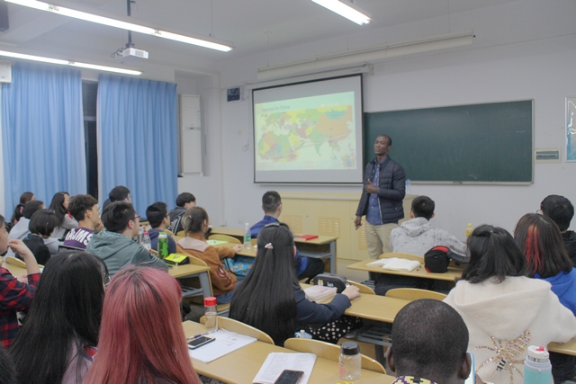 本次交流会大体分为两个部分,第一部分是留学生同学对非洲的讲解,来自多哥的卓越和来自加纳的巴杰明,以PPT的形式热情大方地向同学们展示了本国的历史、文化、资源、人口等基本情况,以自己的国家为代表,还涉及到了非洲其他国家和地区的发展情况,从他们自身出发,让同学们以不同的视角对非洲有了更进一步的认识。第二部分为现场提问环节,提问开始,在两位留学生的热情带动之下,同学们积极提问,说出自己的想法,留学生也一一为同学们解答,抒发自己内心最真实的感受,现场氛围轻松、融洽,同学们在交流互动的过程中也对非洲有了更深的了解。