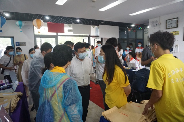 上海海事大学党委书记宋宝儒老师、校长陆靖老师、副校长李志鹏老师,交通运输学院党委书记石娟老师、副书记赵睿老师先后莅临报到现场,了解新生报到情况,亲切慰问新生和学院迎新团队,让交通运输学院的师生倍感温暖�